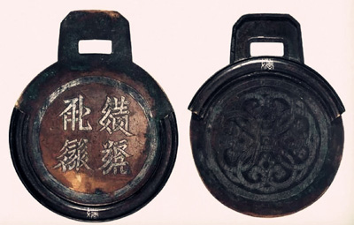 为西夏传递急令的信牌,铜制圆形套合式,两个圆牌上下插扣可以咬合成一体,圆牌直径14.7公分,带銎长18.5 公分,盖牌镌刻西夏文“敕燃马牌”四字,底牌内面有四连忍冬花纹装饰,两牌上下嵌合槽齿端各镌错银西夏文“敕”字,现藏中国国家博物馆。“敕燃马牌”精致美观,堪称历代邮驿符牌中的极品。“敕燃马牌”,意为“敕令驿马昼夜急驶之牌”,是西夏皇帝授权动用驿马急驰以传达调动军队命令的通行证明。