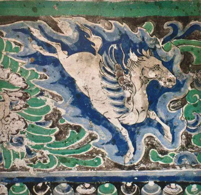彩绘飞马出自甘肃省酒泉市瓜州县榆林窟第10窟的西夏时期窟顶藻井。飞马亦称翼马,是藻井四披上与翔凤、飞雁、游龙、奔狮、麒麟、天鹿、六牙白象一起绘制的佛国瑞禽。