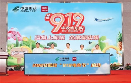 邮政919,丰收欢乐购。9月1日,第六届中国邮政“919电商节”正式启动。作为农业农村部主办的第五届“中国农民丰收节金秋消费季”系列活动之一,今年的“919电商节”,中国邮政进一步强化“邮政919,丰收欢乐购”主题,推出乡村振兴“万单计划”、“百大品牌”特惠活动、社区团购“万团齐发”等“十大活动”,助力农民创利增收、农村消费提质、农业兴旺发达,全面构建邮政农村电商新生态,为乡村振兴注入新活力。国家邮政局副局长戴应军,农业农村部农村合作经济指导司一级巡视员赵铁桥,国家乡村振兴局社会帮扶司司长李富君,国家邮政局普遍服务司司长马旭林,商务部流通发展司副司长张祥;中国邮政集团有限公司党组书记、董事长刘爱力,副总经理康宁、温少祺,总会计师郭成林等出席。